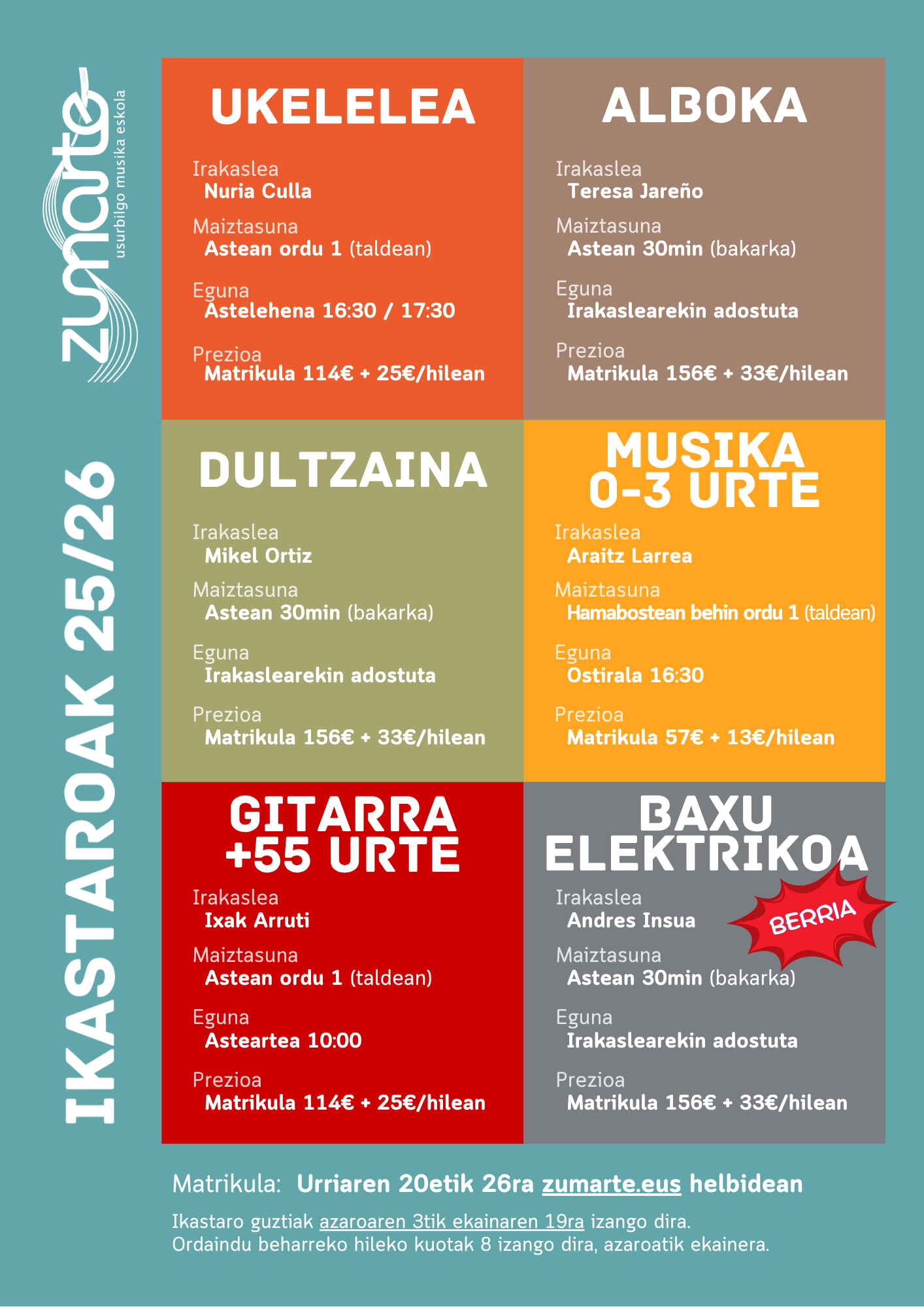 Aurtengo ikasturtean ere ikastaro trinko aukera zabal bat prestatu degu zuentzat. Lehengo urtetako ikastaroez gain, baxu elektrikoa ikasteko aukera dago aurten. Matrikulazioa Urriaren 20tik 26ra izango da online web orri …